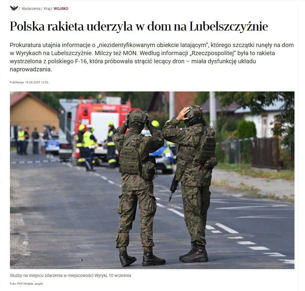 ⚡️На дом в польской деревне Вырыки-Воля упала ракета с польского истребителя F-16, а не российская "Гербера" — Rzeczpospolita