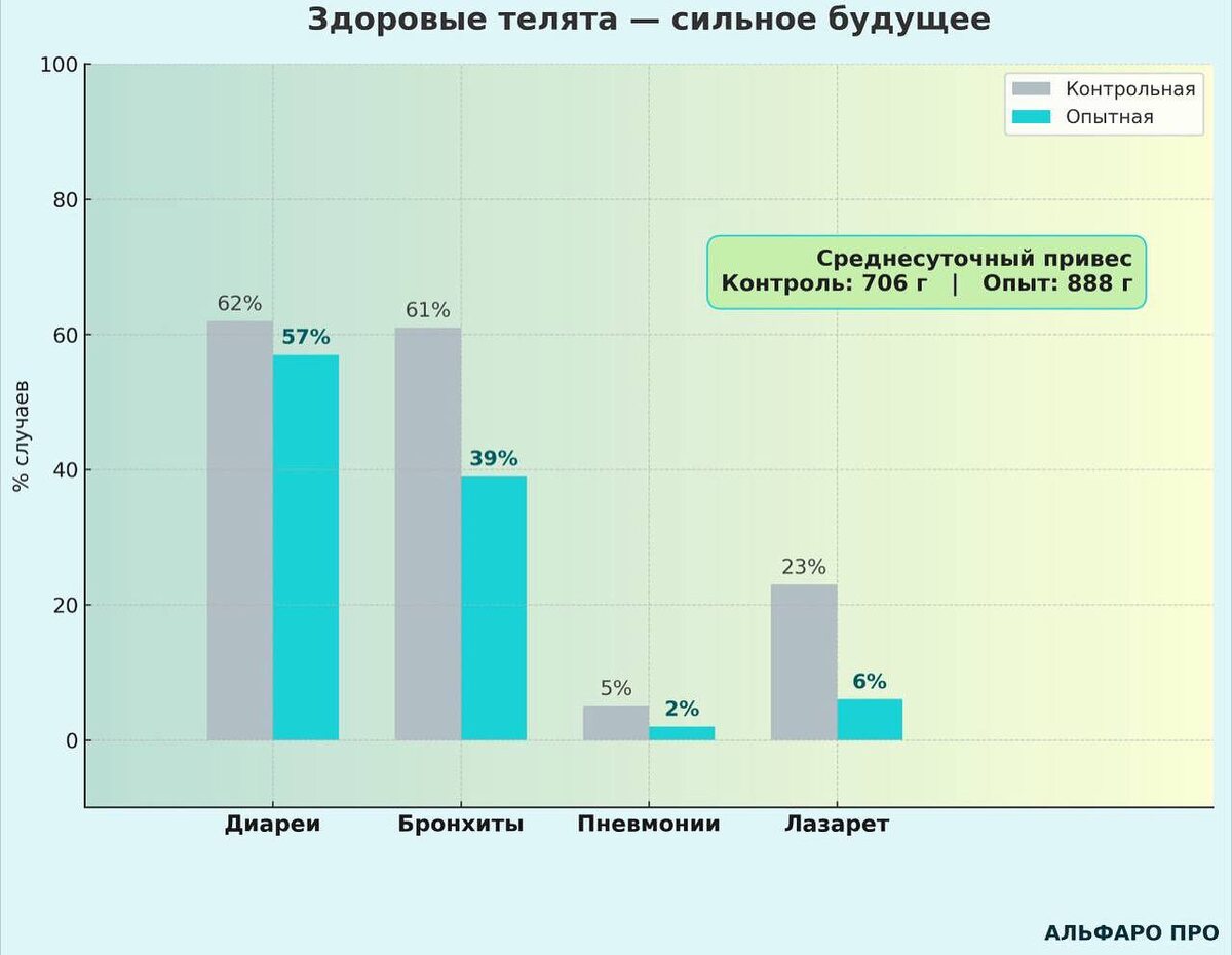Друзья, всем привет! 🐮Мы завершили эксперимент у одного из наших партнёров на телятах с применением Эсид-Пак. Делимся результатами. 📊Исходные данные: ❕Опытная группа — 96 голов, средний вес при рождении 37,9 кг; ❕Контрольная группа — 102 головы, средний вес при рождении 37,4 кг. 🍼Как применяли: 1️⃣Готовили маточный раствор: в 1 литре воды температурой 36–38 °C растворяли 430 г Эсид-Пак до получения однородной смеси (допускается лёгкий осадок, он не влияет на качество); 2️⃣Маточный раствор задавался через систему подачи жидких компонентов на молочной станции; 3️⃣Дозировка составляла 3 мл маточного раствора на 1 литр ЗЦМ, что соответствует 1,3 г Эсид-Пак на 1 литр ЗЦМ. 📊 Результаты (контроль / опыт): Суточный привес: 706 г / 888 г Диареи: 62% / 57% Бронхиты: 61% / 39% Пневмонии: 5% / 2% Вывод в лазарет: 23% / 6% ✅ Вывод: Случаи диареи снизились на 5%, при этом мы наблюдаем значительное уменьшение заболеваний дыхательных путей и резкое сокращение числа телят, выведенных в лазарет. Это