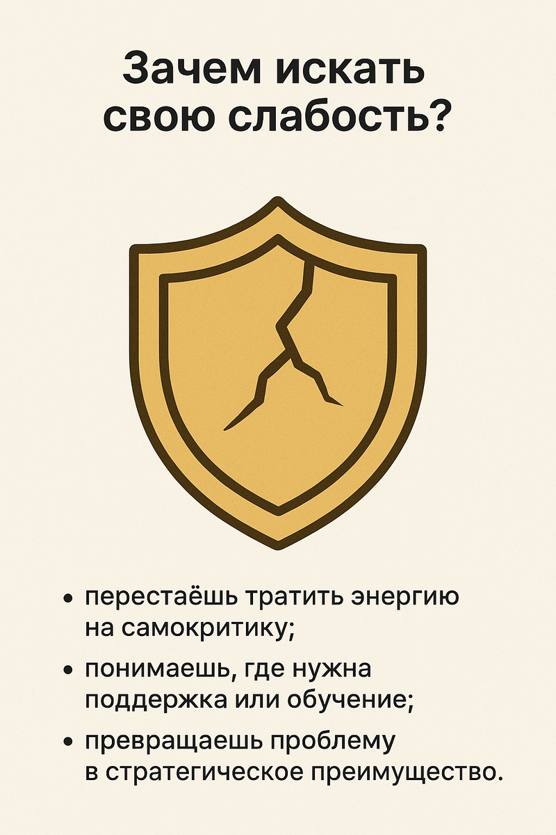 Будь то публичные выступления, умение сказать «нет» или привычка тянуть до последнего — у каждого есть что-то, что мешает двигаться вперёд. И вот тут включается метафора «Ахиллесовой пяты». Даже самый сильный воин имел уязвимость. Но в жизни это не приговор, а шанс. Важно: слабость — это не конец, а начало новой силы. Раздели лист на 2 части: Запиши по 3–4 пункта. 📊 Инфографика/схема «Слабость может стать твоей суперсилой, если работать с ней шаг за шагом». Твоя Ахиллесова пята — это не точка поражения, а отправная точка роста. Слабость = ресурс.
