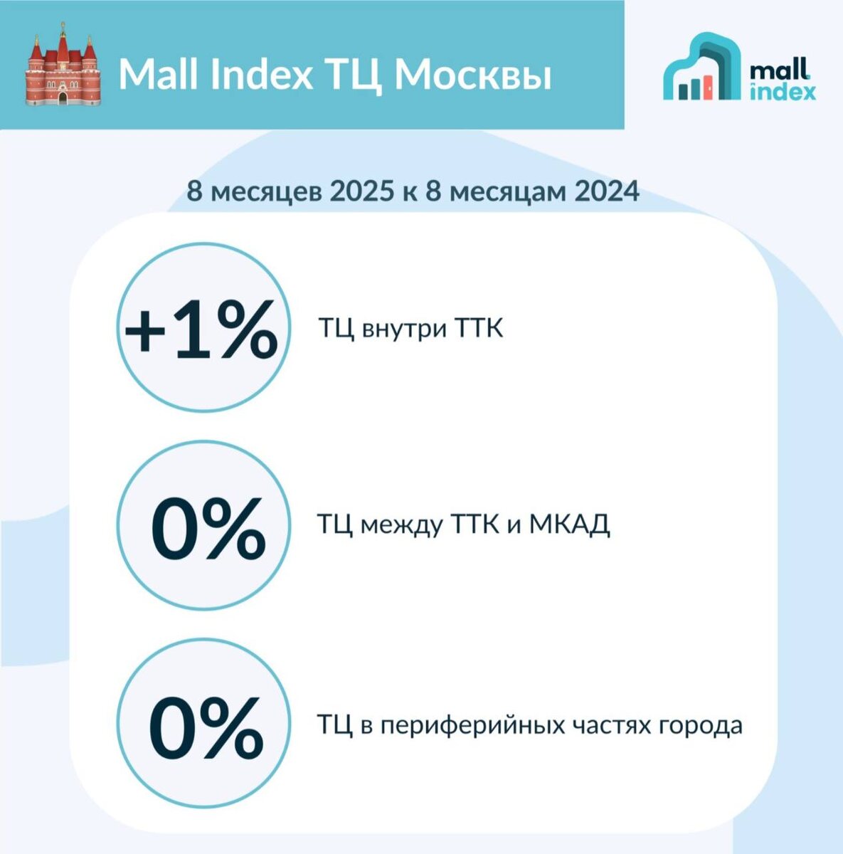 📊 Mall Index Москва (8 месяцев 2025 к 8 месяцам 2024) ТЦ расположенные внутри ТТК: +1% ТЦ расположенные между ТТК и МКАД: 0% ТЦ в периферийных частях города: 0% Показатели московских торговых центров в текущем году близки к прошлогодним значениям. При этом объекты расположенные в центральных и близких к ним частях города чувствуют себя несколько лучше – Михаил Васильев, Focus Technologies. 👉🏼 Причины: •Близость к зонам с естественным потоком (деловой и туристический трафик) • Объекты в среднем меньшего формата, ориентированные на ежедневное посещение.