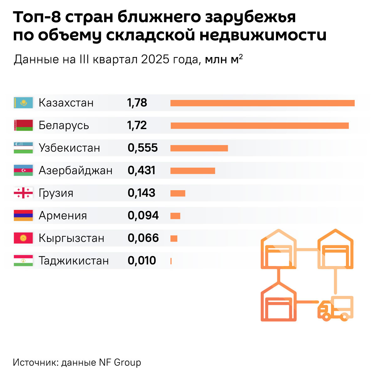 О причинах значительного отрыва страны от соседей рассказал Sputnik на русском (@sputnik_rus) рассказал редактор LogiStan Григорий Михайлов. Развитие складской инфраструктуры напрямую связано с торговым оборотом. В рейтинге стран СНГ по площади складских объектов первые позиции занимают Казахстан, Беларусь и Узбекистан, т.к. через эти страны идет большое количество транзитных поставок.