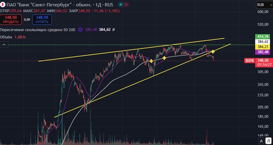 #BSPB #банкСПБ ➡️Построил клин, о котором я писала ранее в предыдущем разборе. 📊 Фигуру подтвердил, так как пробил косой уровень 376,4 и закрепился ниже этого уровня. ✔️Движение вниз будет продолжено, открывать лонговые позиции рановато. 🔽 Отработка фигуры примерно до 260 руб. НЕ ИИР