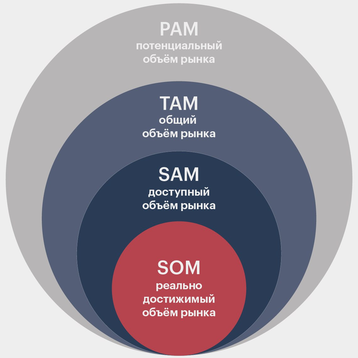 💡 PAM — Potential Available Market — потенциальный объём рынка. PAM учитывает не только текущее состояние рынка, но и прогнозируемые изменения в будущем - рост или падение. PAM рассчитывается исходя из максимально широкого числа людей и организаций, которым может быть интересен продукт в перспективе. 💰 TAM — Total Addressable Market — общий объём целевого рынка. TAM учитывает наиболее широкий круг потребителей, которым в теории можно реализовать продукт: потенциальных покупателей, клиентов конкурентов, а также тех, кто подобными товарами или услугами пока не пользуется. TAM включает всех, у кого есть потребность в продукте. При этом неважно, готовы ли они платить за ваш товар прямо сейчас или нет. TAM показывает идеальную ситуацию, при которой продукту удалось занять весь рынок. На практике же это невозможно: в реальности к целевым показателям могут приблизиться только монополисты. Зато TAM демонстрирует потенциал расширения на рынке. В отличие от PAM ТАМ учитывает текущую ситуацию и