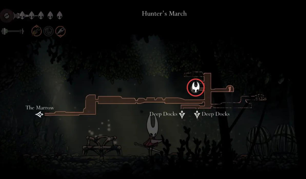 Заветная точка находится в правой верхней части локации в комнате-«колонне». Добраться туда несложно, но просто так воспользоваться скамьёй не выйдет. Подойти к скамье не получится, не активировав ловушку-топор, который может убить Хорнет, если у неё мало здоровья. Сначала нужно отключить устройство — для этого иди в скрытую комнату слева и ударь по рычагу на потолке. Теперь можно присесть и отдохнуть.