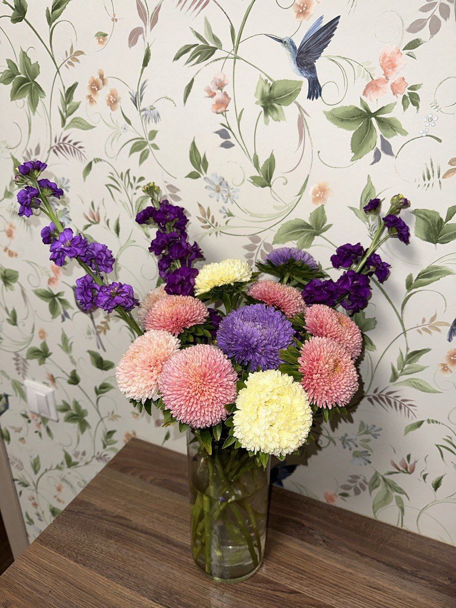 Уже много лет я не выращивал астру, соскучился. В этом сезоне посеял,всхожесть 100%, семена от Партнёра. Цветок плотный, необычных оттенков, очень стойкие😍. Решил сегодня немного украсить свой дом, срезал в дополнение левкой, аромат🤩👍