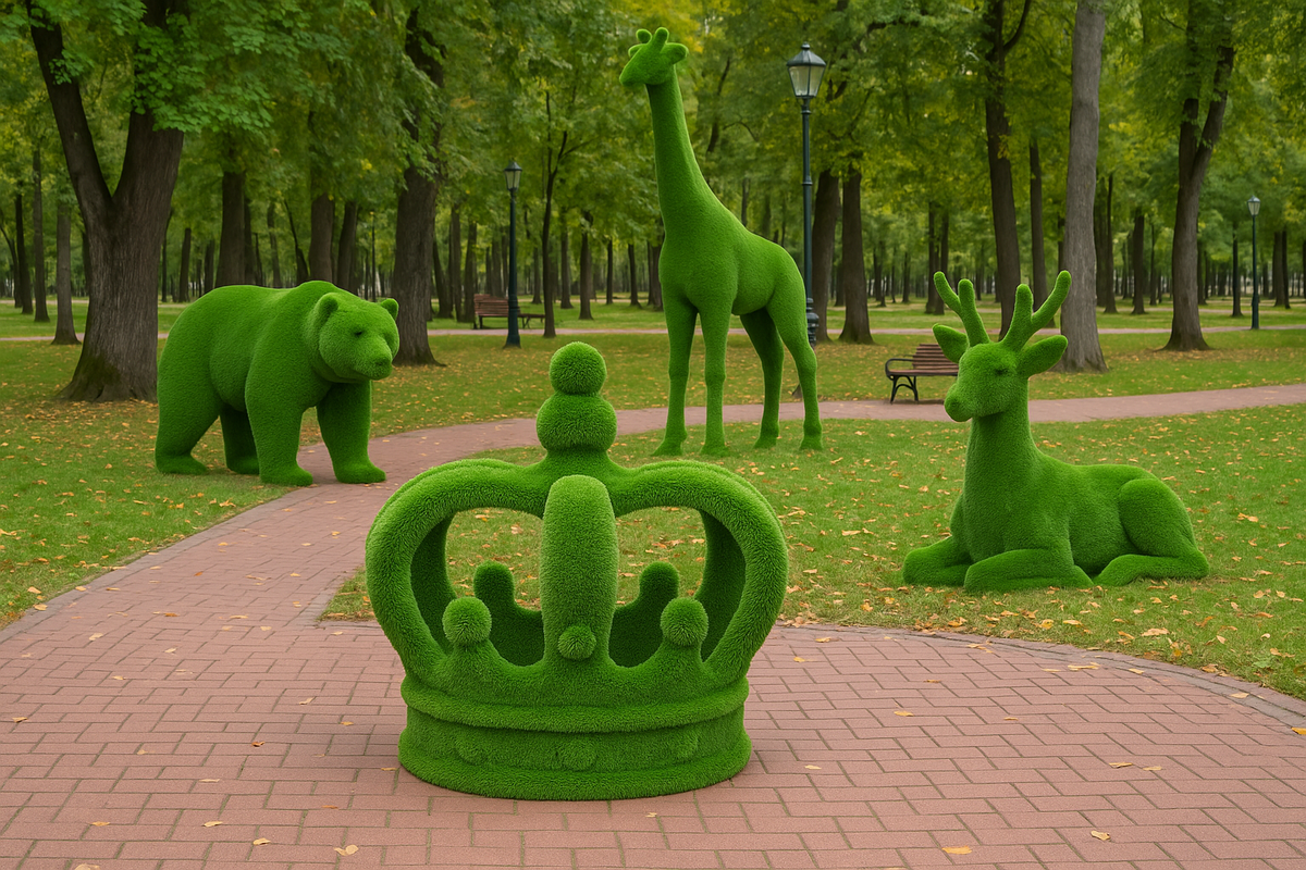 Это зелёные скульптуры, выполненные в форме животных, геометрических фигур или фантазийных образов. Их изготавливают из искусственного газона или живых растений, в зависимости от задачи и места установки. ✨ Где используют топиари 🏡 Почему они популярны