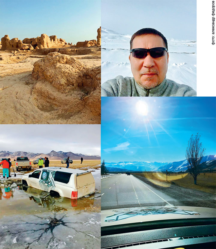 Чатыр-Куль оправдывает свое киргизское название «небесное озеро»: он находится на высоте более трех с половиной тысяч метров. Гигантская гладь воды уже за добрый десяток километров отражает солнечный свет так ярко, что не помогают даже горные очки. Пробираясь по заболоченным берегам, наша колонна преодолевает множество замерзших речушек и покрытых льдом проток. На земле держим дистанцию и стараемся ехать по следам впереди-идущей машины — так спокойнее. Речной лед, напротив, проезжаем по целине, там, где он кажется крепче. Что подвело нашу техничку — кажущийся надежным лед или же просто большая масса припасов и оборудования в кузове — сказать сложно. Проезжая через замерзшую протоку, номер восемь проломил лед и сел задними колесами в глубокий ил. Колонна мгновенно развернулась. Минут десять ушло на расчистку полыньи от ледяной каши и на то, чтобы заякориться тросами друг с другом двум прочно стоящим на твердой земле «Амарокам». Остальное сделала лебедка. Процент потерь оказался небольшим: пара глубоких царапин на кузове от льда да запах тины, прописавшийся на несколько следующих дней в салоне.