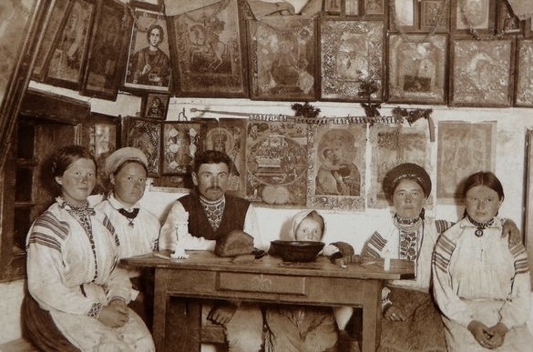 У малорусов и молдаван какая-то особая любовь завешивать стены над столом рядами икон. Их будет не одна-две, а сразу пара дюжин больших икон. Из этих образов создают длинные ряды, расходящиеся по стенам от главной домовой иконы в красном углу. Если хватит денег, то будет по три ряда икон. Кроме рядов по стене, сделают еще и ряд, скрывающий стык потолка и стены. Действительно сложно улыбаться за завтраком, когда тебе в затылок смотрит двадцать святых… 🔸Интерьер хаты. Красный угол. 🔹Малорусы 📍Волынская губ., Ковальский у. и округа, 1916 г. #лр_бытовуха @inshakovnik