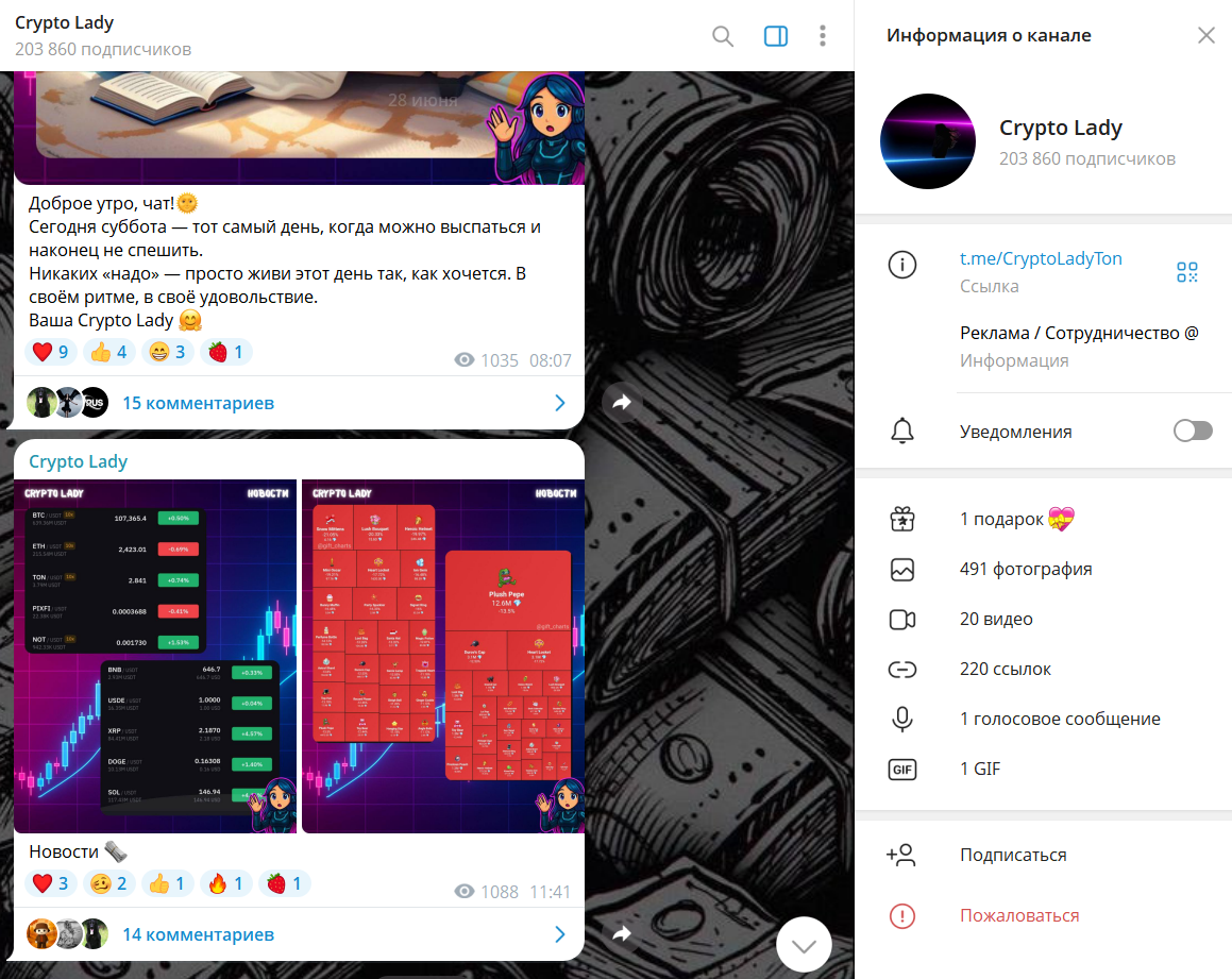 Канал Crypto Lady выглядит как крупное сообщество с более чем 200 000 подписчиков. На первый взгляд — это площадка для обсуждений, новостей и «дружеской атмосферы». В ленте публикуются утренние сообщения, скриншоты с ценами криптовалют и посты с «лайфстайлом». ✅ Кстати, проверенный метод заработка здесь ◀️ Однако за внешней оболочкой скрывается типичная схема: внимание пользователей удерживается лёгкими и нейтральными постами, а ключевой трафик направляется на закрытые сервисы, партнёрки и рекламные проекты. 📌 «Подписалась ради аналитики, но в итоге только реклама и ссылки на какие-то боты».