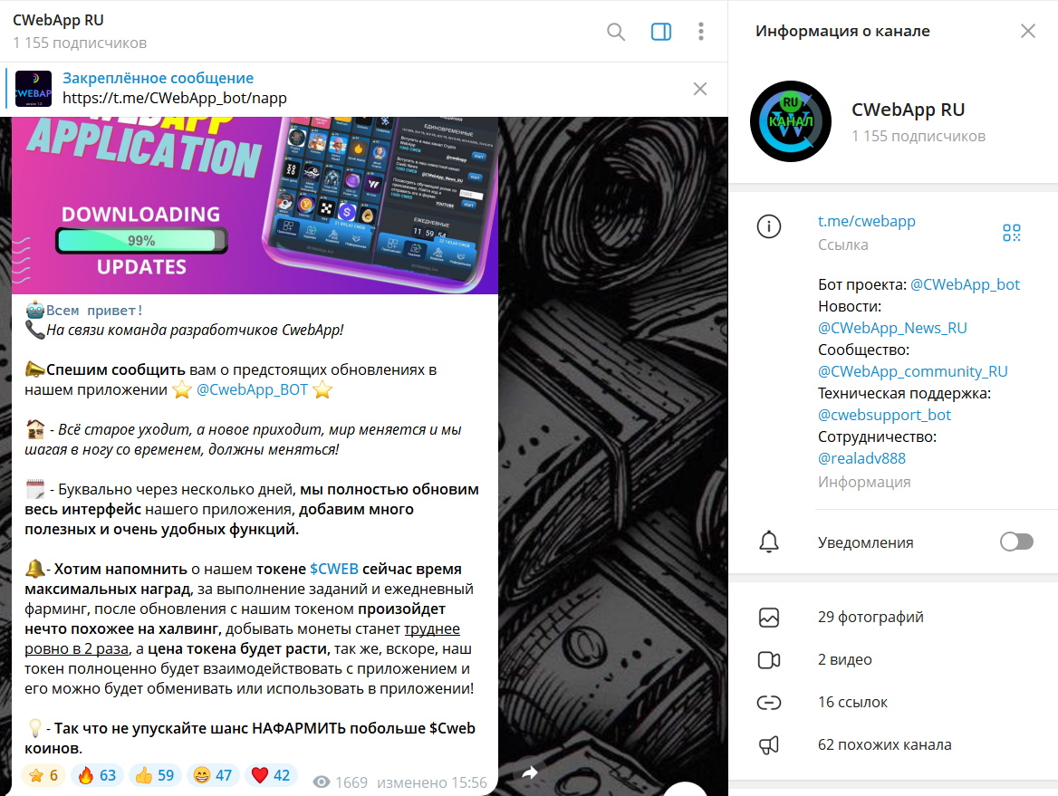 Канал CWebApp RU подаётся как официальное сообщество разработчиков одноимённого приложения. Здесь публикуются новости о «новых обновлениях интерфейса», функциях и возможностях заработать на внутреннем токене $CWEB. ✅ Кстати, проверенный метод заработка здесь ◀️ На первый взгляд создаётся впечатление серьёзного IT-проекта с перспективами развития и «фармингом токенов». Однако при внимательном рассмотрении схема напоминает типичную игру на доверии: пользователей вовлекают обещаниями будущего роста и уникальности токена. 📌 «Зашёл ради приложения, а в итоге только разговоры о токене».