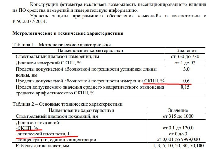 Как рассчитать неопределенность типа В для спектрофотометра из пределов погрешности? Столкнулся тут с мнением, что для спектрофотометра легко рассчитать неопределенность типа В из пределов погрешности. В описании типа спектрофотометров и фотометров указано относительное значение пределов погрешности, в зависимости от прибора от 0,5 до 1%. Вроде как достаточно умножить получаемые нами значения оптической плотности на этот предел, а потом разделить на корень из трех, и вот нам неопределенность по типу В. Но это не так. В описании типа на спектрофотометры и фотометры указаны пределы допускаемой абсолютной погрешности для коэффициента направленного (свето)пропускания. Вот например КФК-3 №32672-06, установлены "Пределы допускаемой абсолютной погрешности измерении СКНП, %" = ±0,6 1) пределы абсолютной погрешности, а не относительной 2) пределы погрешности для спектрального коэффициента направленного пропускания, а не оптической плотности. 3) Да, этот коэффициент измеряется в процентах (%).