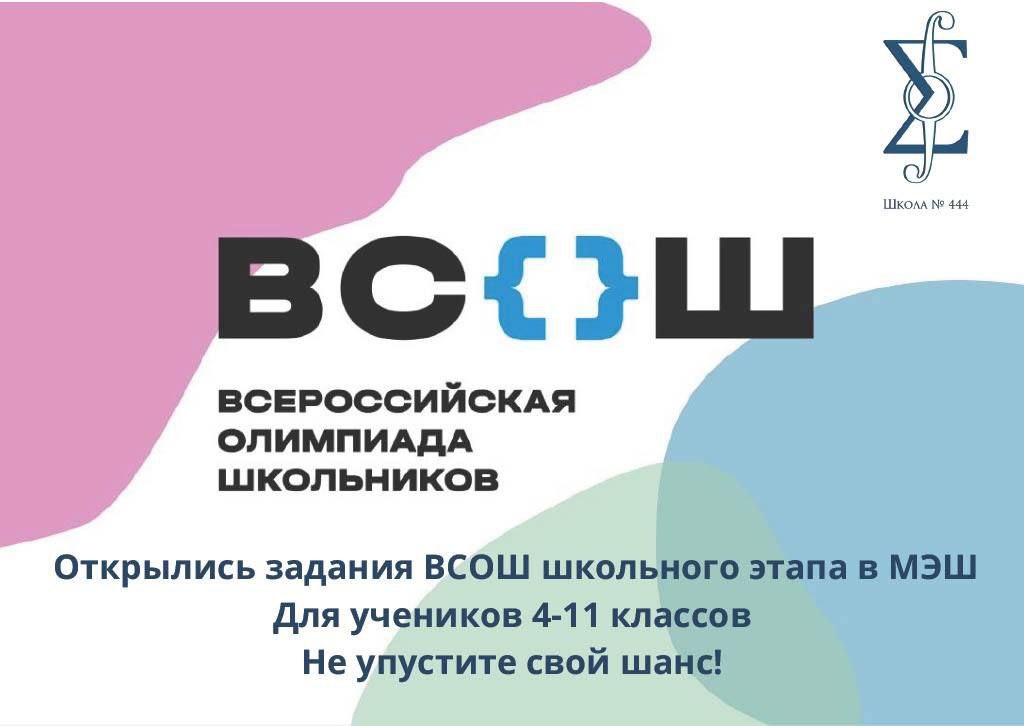 ❗️Стартовал школьный этап Всероссийской олимпиады школьников❗️ Друзья, успейте принять участие! На этой неделе для учеников 4-11 классов уже открыты олимпиады на портале Московской Электронной Школы (МЭШ) по следующим предметам: 📖 Литература; 📚 Русский язык; 🏛️ Обществознание; ➗ Математика. ❗️ Олимпиада по большинству предметов проводится для учащихся 5-11 классов, по русскому языку и математике —4-11 классов, по искусству (МХК), физике, химии, экономике – 7-11 классов. 🔸 Можно выбрать олимпиаду для своего класса или для более старшей параллели! 🔗 Ознакомиться со сроками, графиком и результатами Олимпиады Вы можете на официальном сайте ВсОШ. Вся подробная инструкция по регистрации и участию через МЭШ собрана здесь. 🎓 У вас всё получится! #Школа444Москва #ТриЧетверки #МРСД12 #ДОНМ #ШколыКолледжиМосквы
