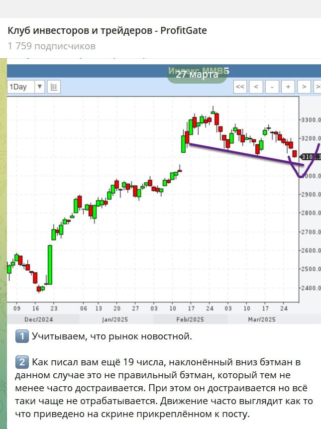 Вот только главное искусство в тех анализе, - понимать когда он не работает. И тот завал был связан не с формацией. Поскольку в большинстве случаев она отрабатывается по другому... И весной я надеялся что её отработают вот так. Об этом не выкладывал тогда в общий канал, но отдельно выкладывал в клуб. Почему это не правильный бэтман и т.д... ‼️Вот примерно на тоже рассчитываю и сейчас.... Надеюсь дважды этот снаряд в одну воронку не у падёт, т.к. обычно это всё отрабатывается по другому. Весной валили на конкретно политических новостях и срыве переговоров и т.д.... Сейчас думаю и переговоры серьёзней и срыв судя по уровням рыка уже в ценах. ☝️Как понять что идёт "нормальная" отработка - это не то что нужно торговать, просто тут нет достаточной вероятности для медведей. И скорее она даже в пользу быков в большинстве случаев из-за "неправильного" наклона линии шеи - понять это можно если уйдём выше 2830 по индексу...