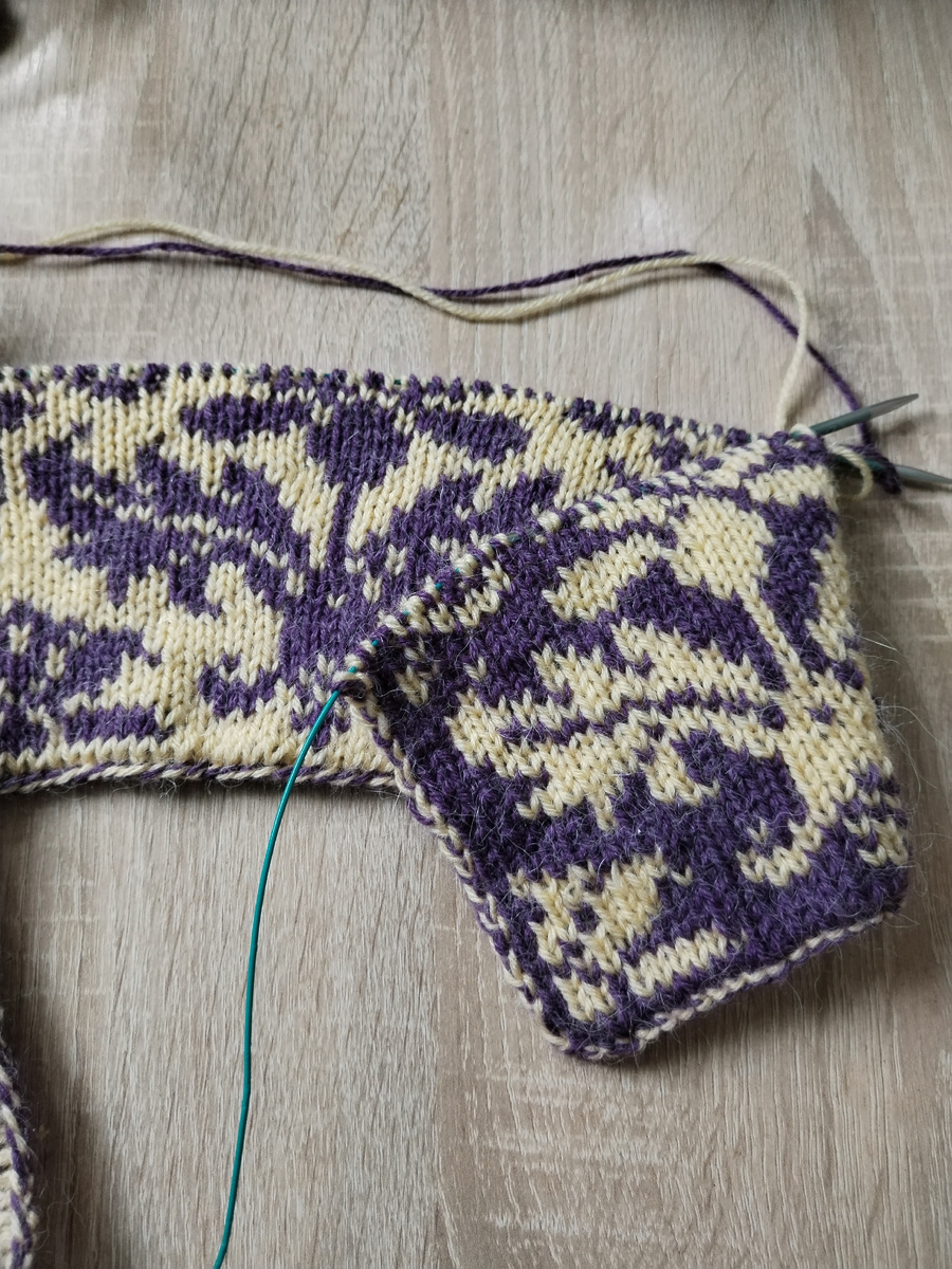 Я продолжаю вязать свой амбициозный проект из двустороннего жаккарда. Работа движется… скажем так, со скоростью черепахи, которая решила изучить дзен. И вроде бы я была готова к медленному процессу, но жизнь решила проверить мои нервы на прочность: на третьем сверху ряду обнаружилась ошибка. Попытка исправить её без распускания провалилась с треском. Пришлось смиренно распустить три ряда. Если бы рядом была драматическая музыка, можно было бы снимать трейлер к фильму «Война и петли».