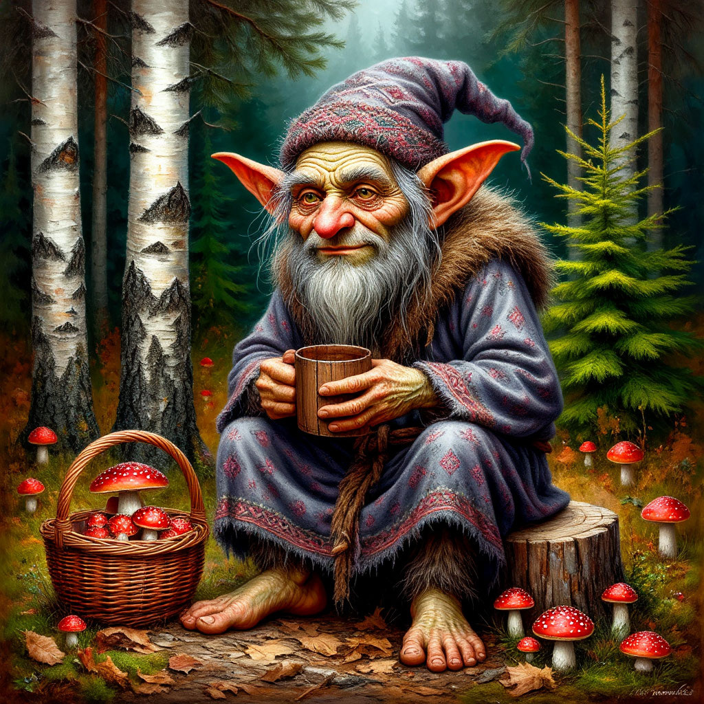 Леший поднялся и поплюхал к берлоге. Там, в дальнем углу у него был оборудован подземный погребок, где в большой дубовой бочке тихо гуляла чистейшая мухоморовка. Дед нацедил кружку напитка, нарезал кусочками на отполированной осиновой дощечке какой-то корешок, подумал и зацепил горсть желудей из стоявшей тут же корзинки.
