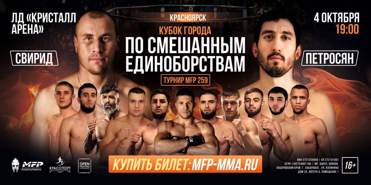 В начале октября спортсмены будут бороться за Кубок Красноярска по смешанным единоборствам Начало соревнований 4 октября в 19 часов в ледовом дворце «Кристалл арена». Гостей ждут 3 часа зрелищного турнира, светового и танцевального шоу, бескомпромиссные поединки, бойцы из разных уголков мира и городов России. Главный бой вечера: Армен Петросян (Красноярск) против Игоря Свирида (Казахстан).