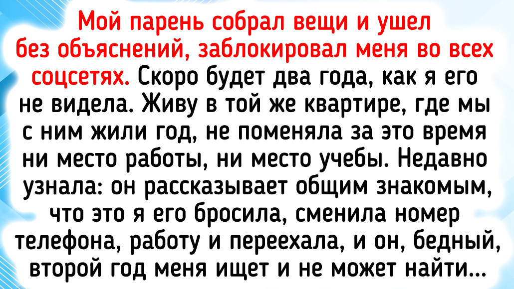 - Бывший парень собрал вещи и ушел без объяснений, заблокировал меня во всех соцсетях. Скоро будет два года, как я его не видела. Живу в той же квартире, где мы с ним жили год, не поменяла за это время ни место работы, ни место учебы. Недавно узнала: он рассказывает общим знакомым, что это я его бросила, сменила номер телефона, работу и переехала, и он, бедный, второй год меня ищет и не может найти. © Подслушано