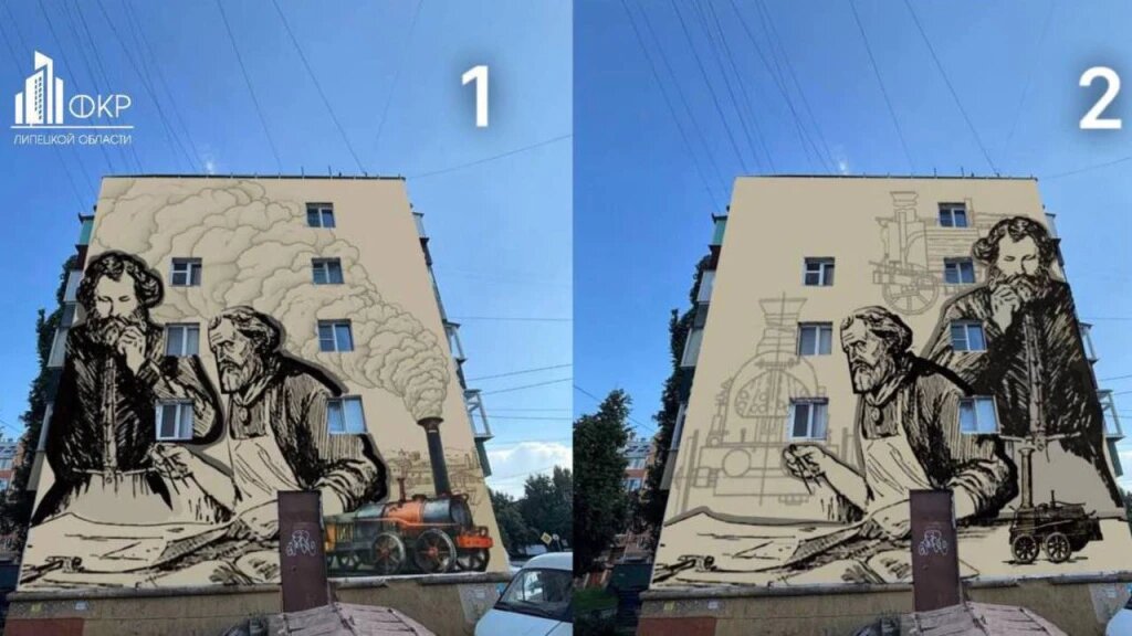 Интересная история развернулась в Липецке на улице Терешковой с оформлением фасада дома № 1/1. Он хорошо виден от железнодорожного вокзала, поэтому архитекторы решили украсить типовую пятиэтажку тематическим граффити. По первоначальному плану на стене дома хотели нарисовать портреты изобретателей первого российского паровоза — отца и сына Черепановых. Но на общем собрании жильцов дома горожане высказались против такой креативной идеи. Представители фонда капитального ремонта пытались уговорить упрямых активистов, но те упорно стояли на своем. Ни один из эскизов граффити им не понравился. Люди не хотели видеть на фасаде паровоз и двух бородатых мужчин. После нескольких встреч с жителями, где обсуждались различные варианты дизайна, было принято компромиссное решение.