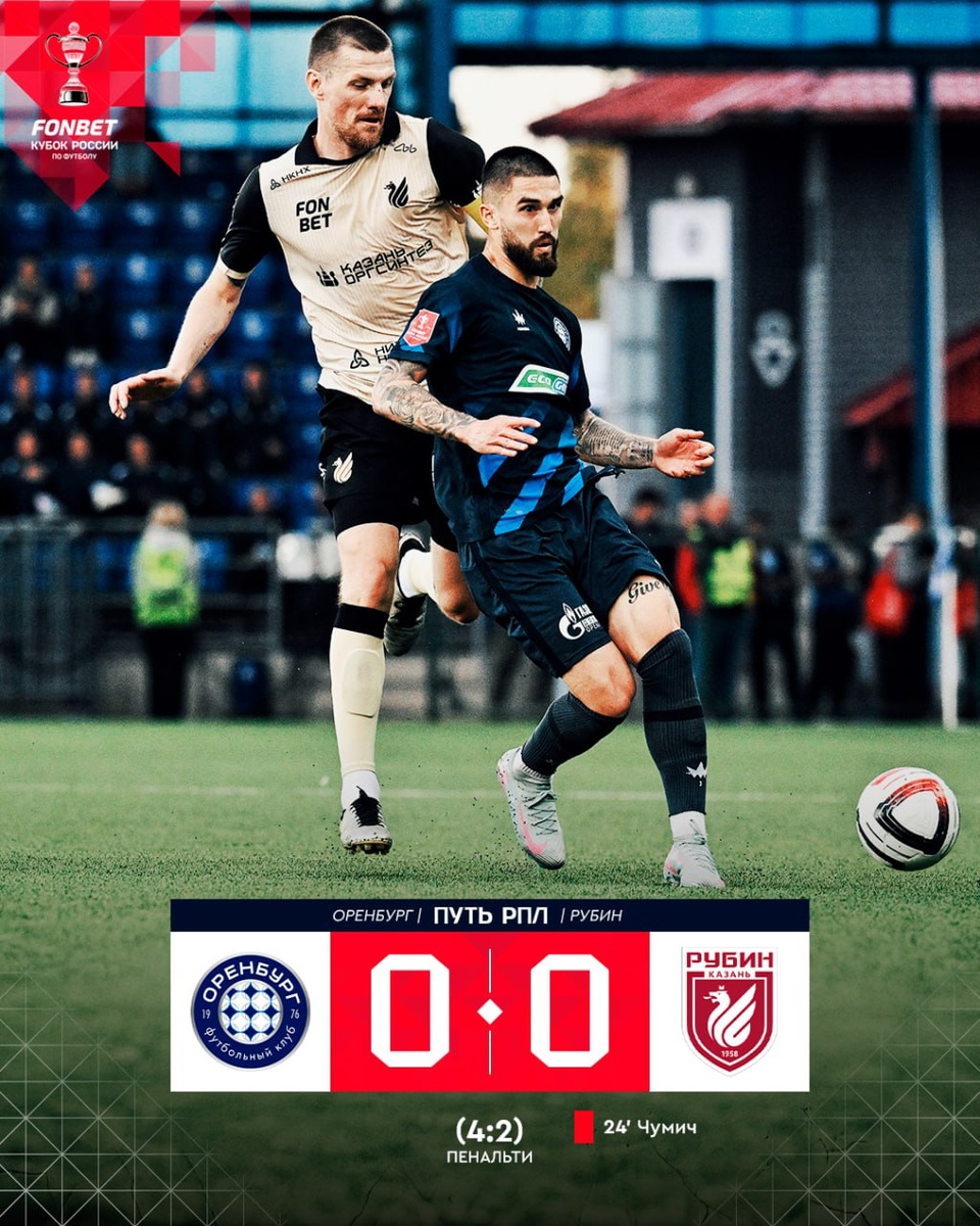 «Оренбург» победил «Рубин» в матче Кубка России Встреча на стадионе «Газовик» завершилась в основное время со счётом 0:0. По ходу игры у казанского клуба был удалён нападающий Никола Чумич. В серии пенальти сильнее оказались подопечные Владимира Слишковича (4:2). Таким образом, «Оренбург» набрал пять очков и занимает второе место. «Рубин» имеет в активе четыре балла и располагается на четвёртой позиции. @russian_rt_sport