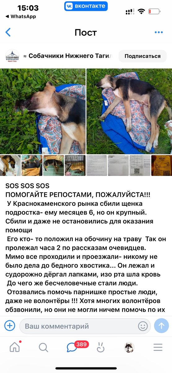 Очень нужны репосты 🙏 🆘🆘🆘🆘🆘🆘🆘🆘🆘🆘🆘🆘🆘🆘🆘 Сбитый щенок из Тагила в тяжёлом состоянии. Несколько часов малыш пролежал на обочине, ожидая помощи людей. Огромное спасибо неравнодушным, благодаря их помощи мальчик был доставлен в местную клинику. Автотравма, перелом черепа, ЧМТ… Прогноз от осторожного до неблагоприятного. Прямо сейчас его везут в Екатеринбург. Здесь его ждут на стационар в клинике. Собак под свое кураторство мы больше не берём. Однако, помогаем в ситуациях, когда о животном нас просят позаботиться временно (как это было с Ириской). Этого малыша, если он выживет, заберёт под свое кураторство Альбина Кильметова. Нас попросили мальчика пролечить и обеспечить местом для реабилитации. Сейчас мальчишку примут в клинике «Дядя Фёдор», чтобы постараться стабилизировать состояние. Если это удастся сделать, позднее мы поедем на приём в клинику Тебенькова и с Вячеславом Владимировичем и Екатериной Валерьевной будем принимать решение о возможности проведения опера
