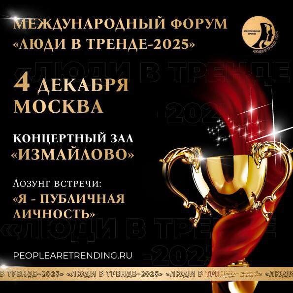 ❤️❤️❤️❤️❤️❤️ ❤️❤️❤️❤️❤️❤️❤️❤️✨ ДОЛГОЖДАННЫЙ ФОРУМ «Люди в тренде-2025» в МОСКВЕ ✨🎙️ ❤️Малый концертный зал «ИЗМАЙЛОВО» ❤️4 декабря 2025 Закрытый формат, вход по спискам🌟 Число гостей 300 человек🌟 ❤️Вас ждут знакомства, которые изменят вашу жизнь и темы, которые заставят жить в тренде! Событие включает в себя 3 части: ❤️Иммерсивный бизнес- форум с участием топовых экспертов, бизнес-стендап, записи подкастов и сюжетов в теле студии Москвы ❤️Торжественная церемония награждения номинантов Международной бизнес-премии «Люди в тренде-2025», ❤️презентация журнала «ДИВА РОССИИ” ❤️Концерт с участием звёзд эстрады ❤️Форум также пройдет в режиме онлайн-трансляций сразу на нескольких платформах: ❤️женское радио «ДИВА ФМ» ❤️мужское радио «ПАПА КАРЛО» ❤️рутуб-канал «ДИВА ТВ» Общий охват аудитории 300000 человек!