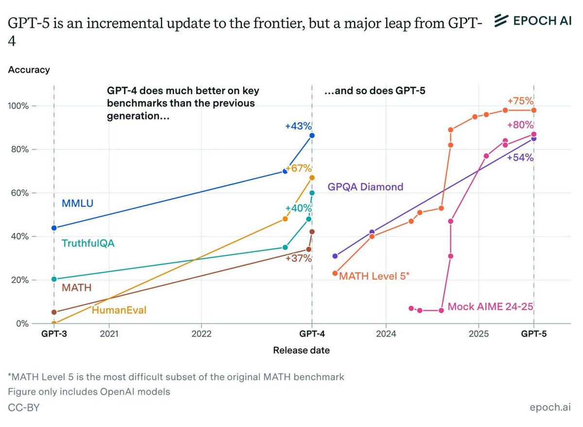 π¨ New report from Epoch AI: GPT-5 is taking the crown from GPT-4! π While GPT-5's debut was quieter than GPT-4's grand entrance, the numbers tell a different storyβthis is another leap, just like we saw between GPT-3 and GPT-4. π π Key benchmark growth: π§ +67% on HumanEval π +80% on Mock AIME π +75% on advanced math (Level 5 MATH) Bottom line: GPT-5 reaffirms the trendβeach generation brings a game-changing boost in capabilities! π₯ Check it out: https://epoch.ai/data-insights/gpt-capabilities-progress
