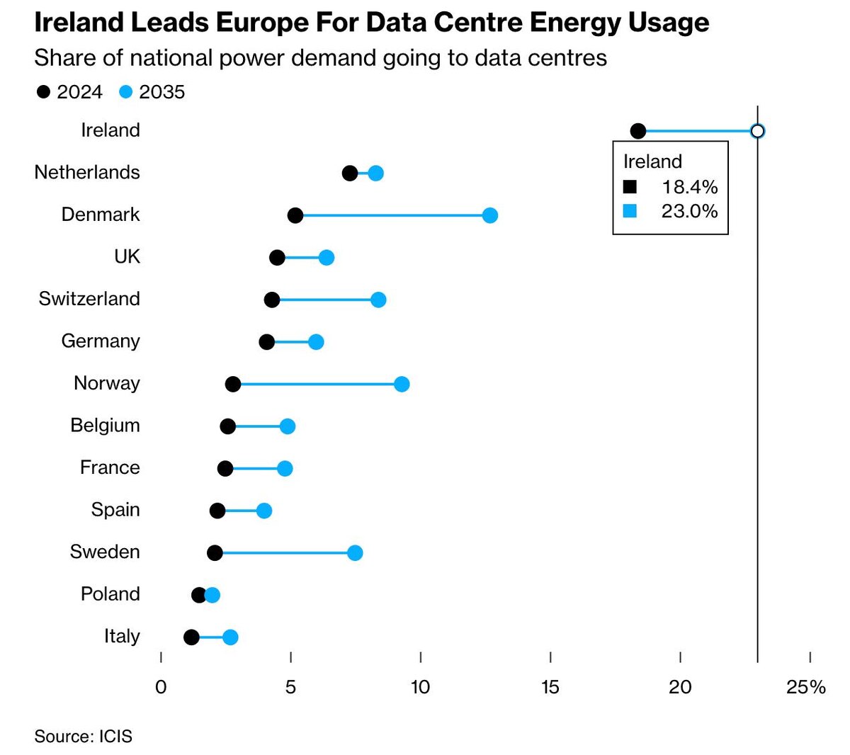 Власти Ирландии могут разрешить центрам обработки данных использовать газ своего энергоснабжения, но через собственную электросетевую инфраструктуру. Построить экономику на одних ВИЭ не выходит. Ирландия лидирует в Европе по энергопотреблению со стороны центров обработки данных. В марте Правительство Ирландии одобрило план по созданию СПГ-терминала. Оператором определили Gas Networks Ireland. На "всякий случай", который теперь сможет зарабатывать.