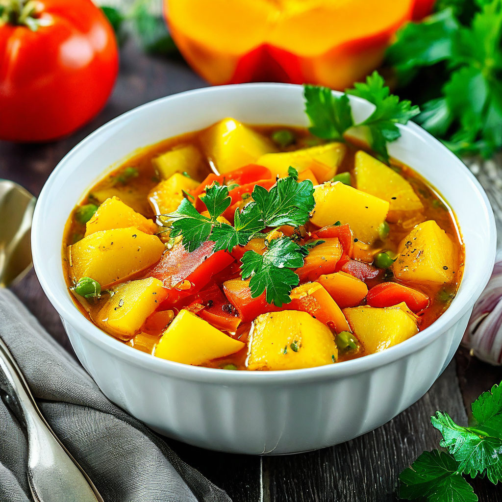 Чтобы приготовить вкусный и полезный диетический овощной суп, начните с подготовки овощей. Мелко нарежьте 100 грамм репчатого лука и слегка обжарьте его на 1 столовой ложке подсолнечного масла в кастрюле с толстым дном. Натрите 100 грамм моркови на крупной терке и добавьте к луку, обжаривайте вместе несколько минут до мягкости. Очистите 180 грамм картофеля и нарежьте его небольшими кубиками. В кастрюлю с обжаренными овощами влейте 1,5 литра воды и доведите до кипения. Добавьте нарезанный картофель. Уменьшите огонь и варите около 10 минут, пока картофель не станет мягким. Нарежьте 50 грамм помидора небольшими кубиками и 50 грамм тыквы также кубиками. Нашинкуйте 120 грамм белокочанной капусты. Добавьте в суп 80 грамм замороженного зеленого горошка и 50 грамм замороженной кукурузы. Затем добавьте нарезанные помидоры, тыкву и нашинков