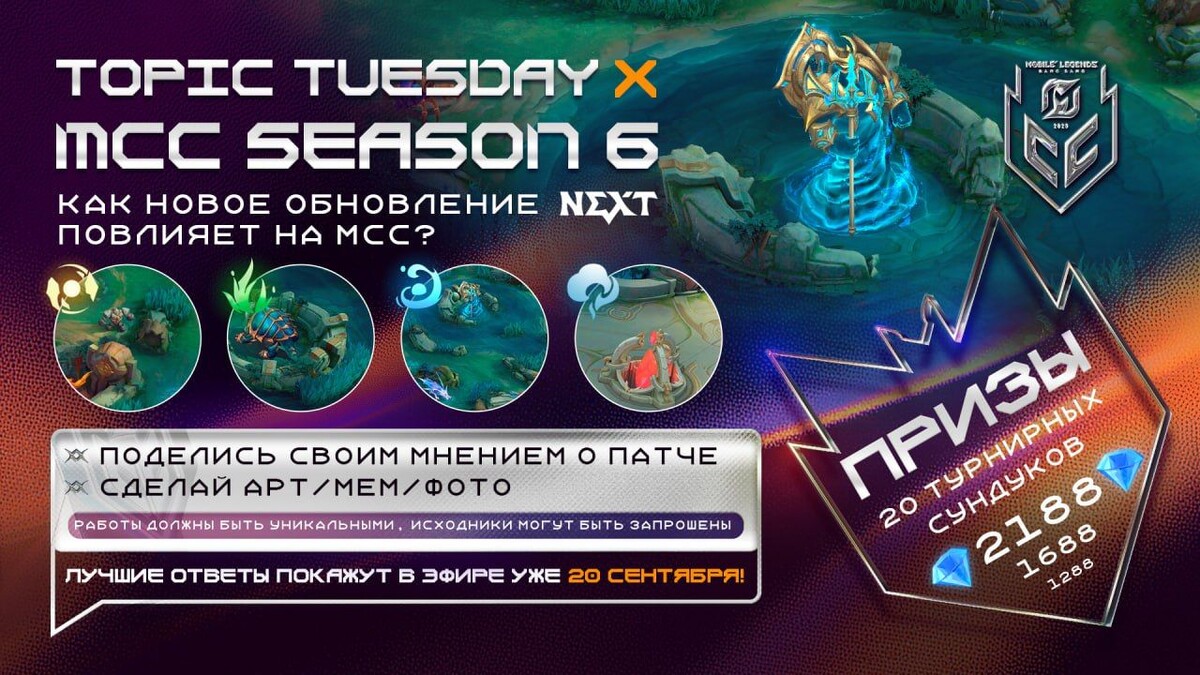 Добро пожаловать на Топик-вторник, где каждую неделю поднимаются самые интересные темы, связанные с Mobile Legends: Bang Bang! 🎮 От матчапов и скинов до уникальных драфтов и праздников — здесь каждый найдет что-то для себя. Поделитесь своим мнением и получите шанс выиграть алмазы и турнирные сундуки. Возможно, именно ваш комментарий покажут в эфире! 🌟В эту субботу стартует вторая неделя регулярного сезона MCC Season 6, которая пройдет уже в новом патче NEXT. Это событие обещает быть захватывающим, так как обновление принесет значительные изменения в мета-игру. 🏆Новый патч NEXT внесет коррективы в стратегии команд и изменит баланс сил на карте. Фанаты с нетерпением ждут, как изменения повлияют на турнирные игры и какая команда быстрее адаптируется к новым условиям. 💥Для участия в конкурсе вам нужно:— Поделиться своим мнением о патче.— Создать арт, мем, фото или другое творческое выражение.— Указать свой игровой айди и сервер айди, чтобы мы могли выдать призы.— Быть подписчиком нашег