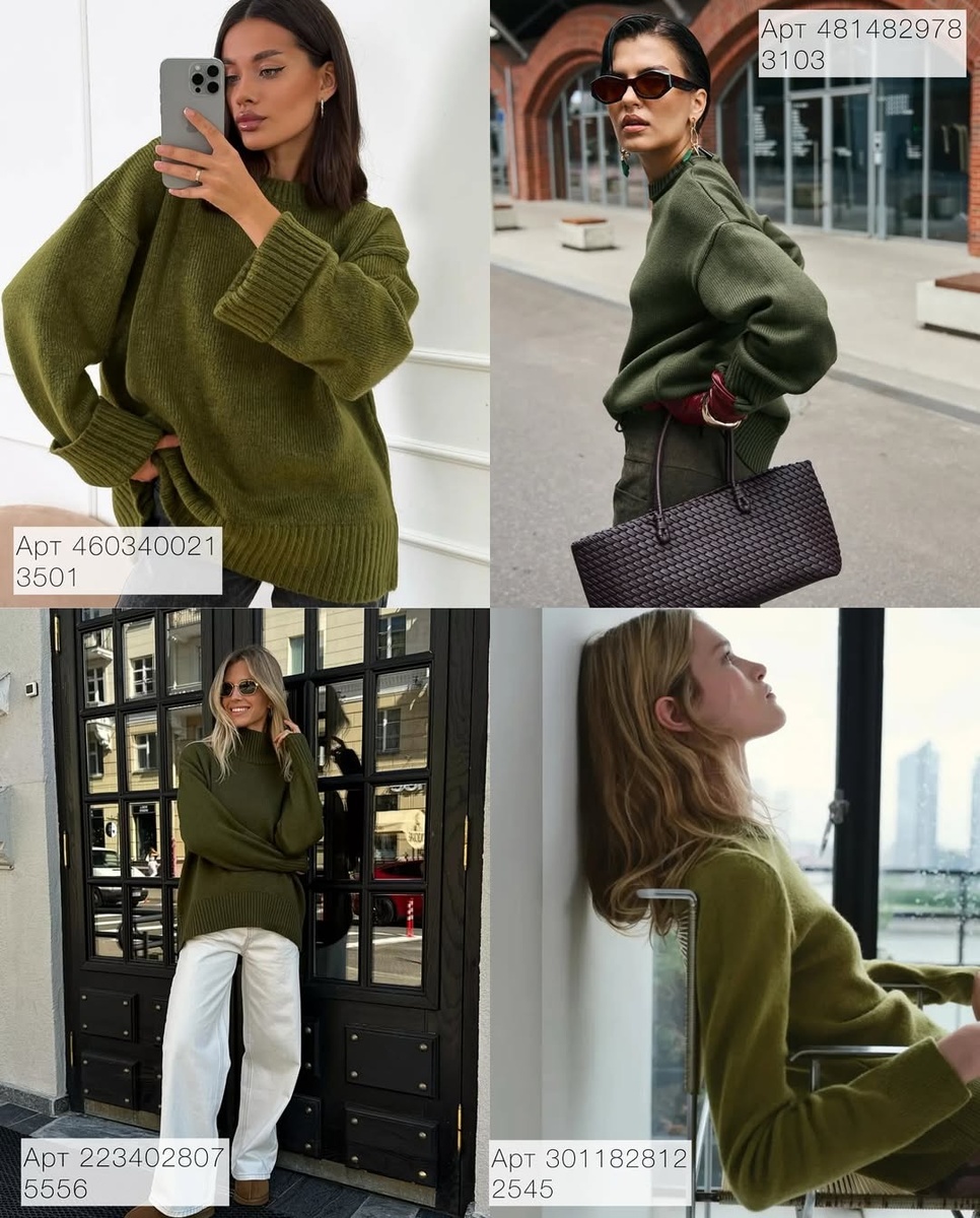 3) Арт. 223402807 (5556) — оливковый свитер и контраст с белыми джинсами