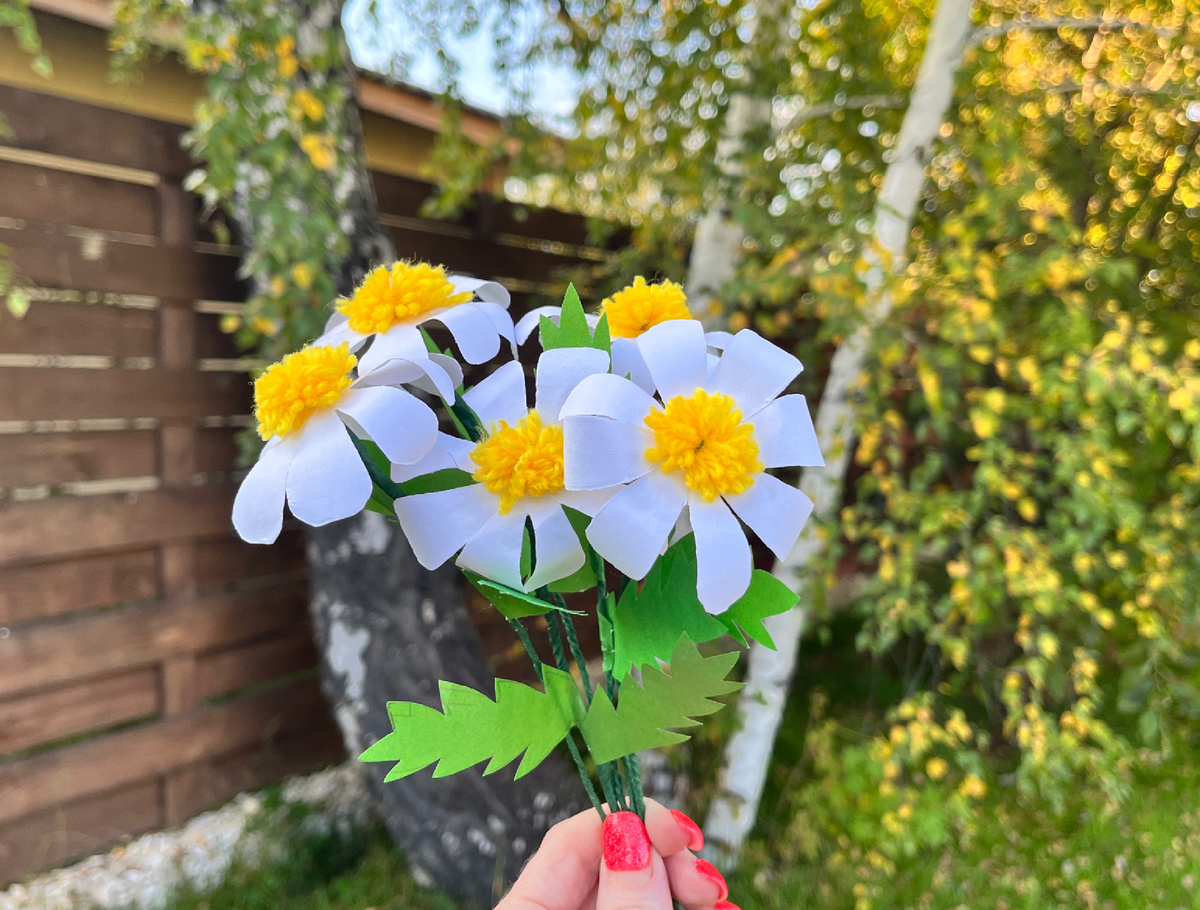 Нам понадобится: ✔️Бумага белая ✔️Пряжа желтого цвета ✔️Проволока ✔️Клей ✔️Тейп-лента ( либо цветная зеленая бумага, либо гофрированная бумага) ✔️Ножницы 1. Бери белый лист бумаги и вырезай из него круг диаметром 8 см. 2. Круг складываем в четыре раза. 3. На одной из сторон этого "сэндвича" рисуем лепесток. Потом аккуратно вырезаем по контуру. Разверни – у тебя получится цветок с восемью лепестками. 4. Берем нитки желтого цвета и щедро обматываем ими свои два пальчика. Чем больше слоев – тем пышнее будет серединка. 5. Теперь берем проволоку и обматываем ею нашу пряжу, крепко-накрепко. Это будет "ножка" цветка. 6. Продень проволочку через центр бумажного цветочка. Вот так, цветок уже "сидит" на ножке! 7. Закругли каждый лепесток при помощи ножниц. 8. Если есть специальная флористическая лента (тейп-лента), обмотай ею проволоку– будет как настоящий стебель. Нет ленты? Не беда! Берем обычную или гофрированную бумагу, режем ее на тонкие полоски и обматываем стебель, приклеивая клеем. П