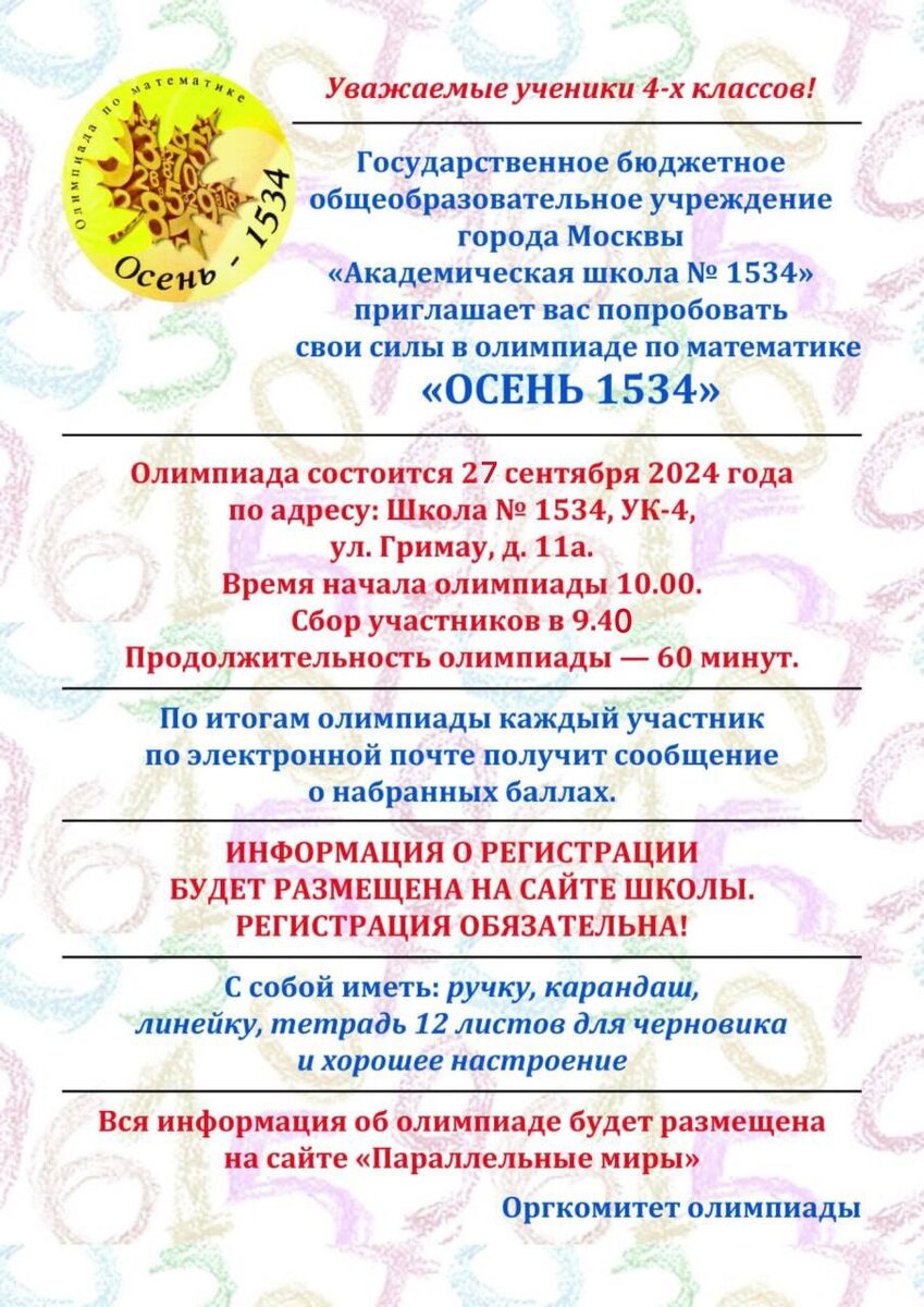 Олимпиада «ОСЕНЬ-1534» 🎉Приглашаем на Одиннадцатую открытую олимпиаду по математике «ОСЕНЬ-1534»! 🗓Мы традиционно проводим олимпиаду ОЧНО в последнюю субботу сентября, 27 сентября 2025 года, с 10:00 по адресу: ул. Гримау, 11А, стр. 3. ⏰Сбор зарегистрированных участников — к 9:40. Убедитесь, что у вашего ребенка есть письменные принадлежности: тетрадь в клетку (12 листов), ручка, карандаш и линейка. 📜 Все подробности можно найти в Регламенте проведения олимпиады (см. вложение). Необходимо ознакомиться с регламентом до момента регистрации ребенка на олимпиаду, так как акт регистрации подразумевает согласие родителей с условиями проведения мероприятия. ❗️Обращаем внимание, что регистрация продлится до 25 сентября (до 15:30). 🚀 Не откладывайте процедуру регистрации, если у вас есть твердое намерение участвовать. Однако не следует регистрироваться «на всякий случай». О завершении регистрации мы сообщим на информационных ресурсах школы. ❌ Незарегистрированные четвероклассники к уч