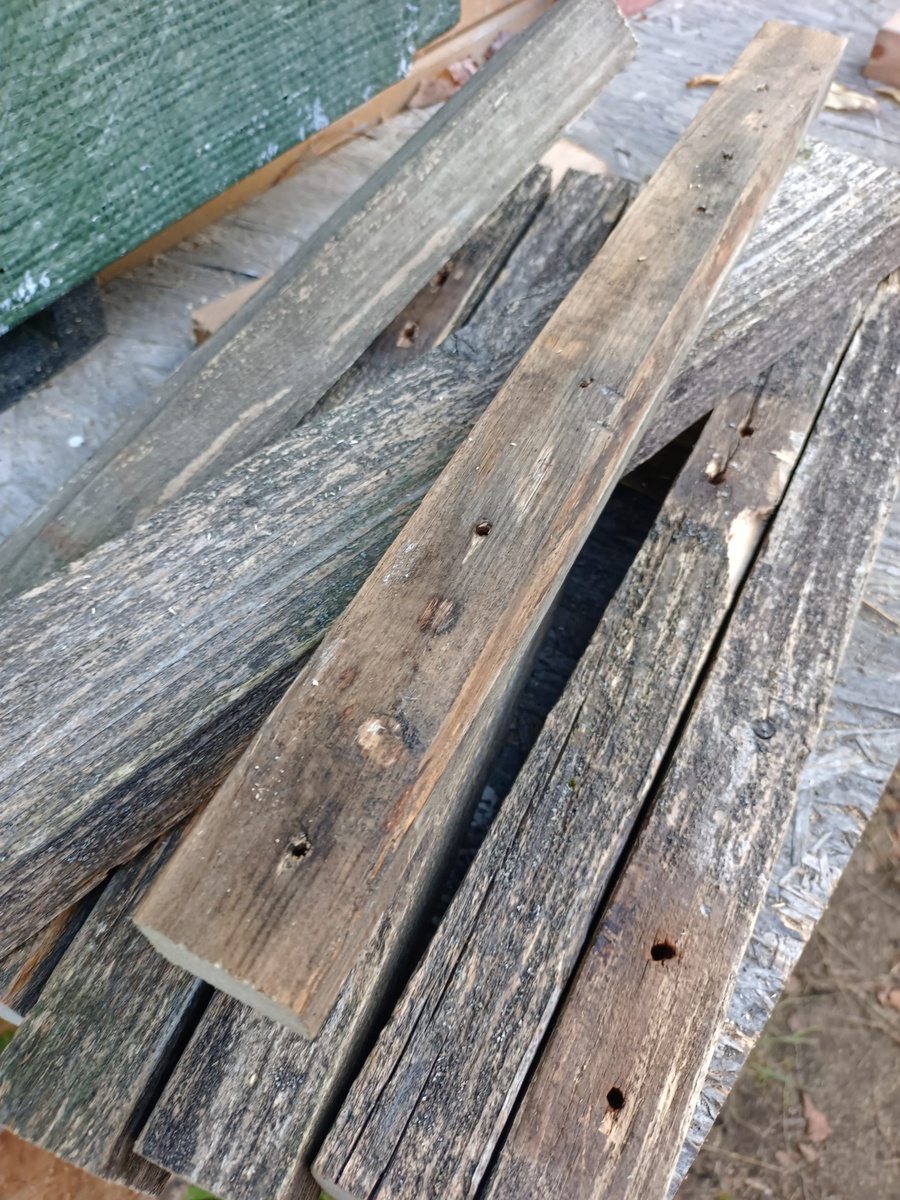 Закончились перемычки. Что подкладываю между слоями длинных досок. Вентиляционные зазоры. Решил сделать их из старой лестницы. С которой я весной упал. Деревянная была. Доски и в снег и в жару под открытым небом. И так 15 лет. Выбил гвозди. Почистил. Распилил на 50см отрезки. Буду дальше обрабатывать.