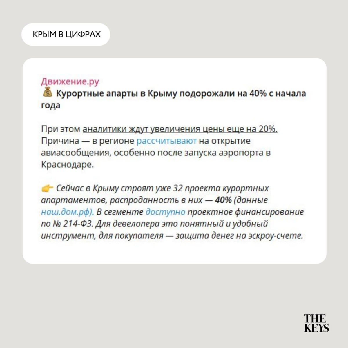 Крым в цифрах: курортные апарты подорожали на 4️⃣0️⃣ % с начала года