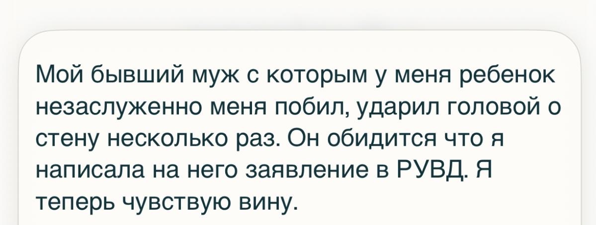 История одной девушки, которая поможет понять, что происходит с психикой жертвы насилия. Эти слова написала девушка, пережившая домашнее насилие. Она разрешила поделиться своей историей, чтобы другие женщины поняли — такие чувства нормальны, и они не одиноки. Почему жертва насилия чувствует вину перед агрессором? Это кажется нелогичным, но психологически объяснимо. Травматическая связь Когда человек находится в зависимом положении и подвергается насилию, мозг включает защитные механизмы. Один из них — попытка сохранить связь с агрессором любой ценой, даже ценой самообвинения. "Может, я что-то сделала не так?" Мозг ищет объяснения происходящему. Проще обвинить себя, чем принять, что близкий человек способен на жестокость без причины. Страх разрушить семью Особенно сильно это проявляется, когда есть дети. Женщина думает: "Я разрушаю семью", "Лишаю ребенка отца", забывая, что насильник уже разрушил безопасность семьи. Газлайтинг Агрессоры часто используют эту тактику: "Ты сама винов