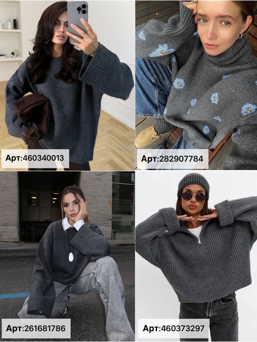 Эти 12 свитеров легко собираются в капсулу «на каждый день»: графит даёт глубину, олива — тепло и благородство, молочные сканди-узоры — праздничную фактуру. Выбирайте 2–3 базовых (460340013, 460340021, 262338220), добавляйте один с характером (463550046 или 199456546) и свитер для многослойности (261681786 или 460373297). Так гардероб работает без пауз — от офиса до выходных.