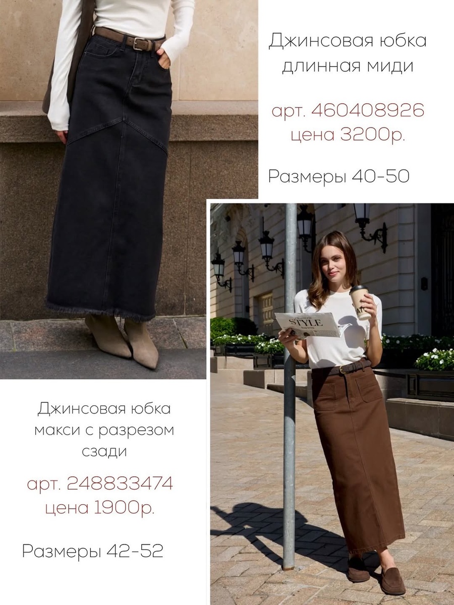 Арт: 460408926 — джинсовая юбка длинная миди (≈ 3200 ₽, размеры 40–50)