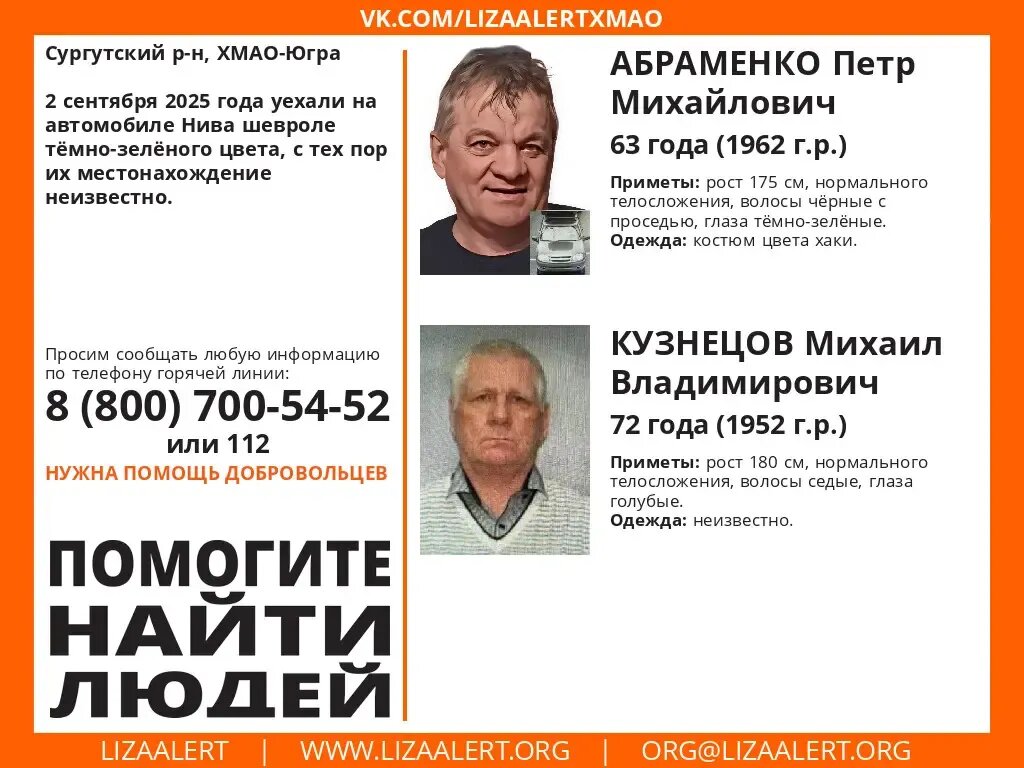 В Сургутском районе ХМАО разыскивают двух пенсионеров — 63-летнего Петра Абраменко и 72-летнего Михаила Кузнецова, которые пропали 2 сентября. Мужчины уехали на темно-зеленой Ниве и не вышли на связь.
