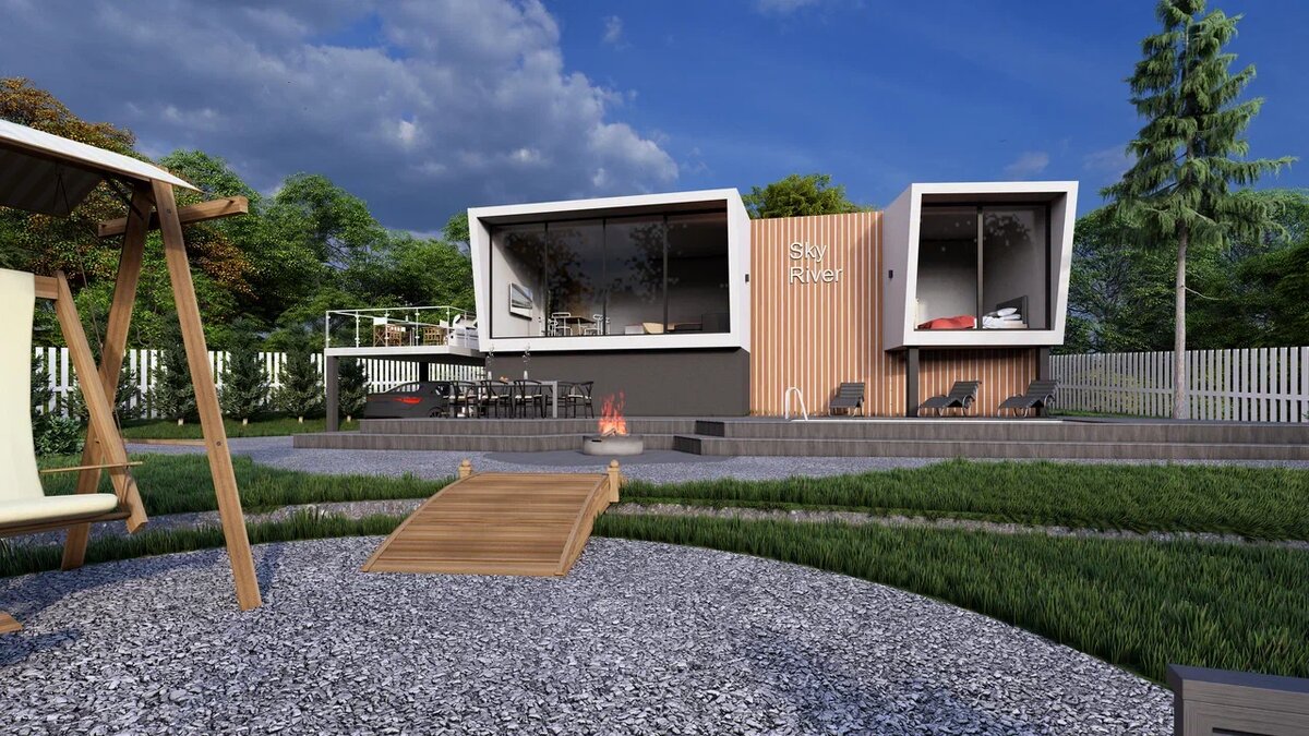 SkyRiver не выглядит большим, но внутри кажется просторным и лёгким. Высокие потолки и панорамные стёкла стирают границы между домом и природой. Каждая зона здесь раскрывает свой сценарий жизни: камин и кухня для тёплых вечеров, спальни для тишины и отдыха, веранды — для летних встреч.