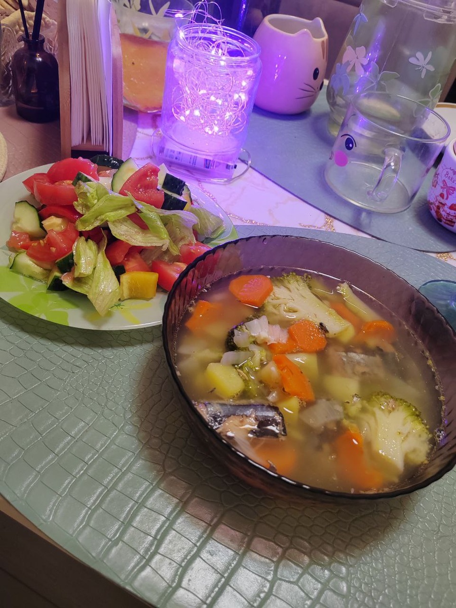 Ужинала я одна сегодня так как Вова уехал по делам и завтра вернется и будет пробовать вкусняшки 😋😊❤️ И у меня на ужин было: ✅ Суп рыбный ✅ Салатик 🥗 со слабосолёной форелью #правильноепитание@krasotka_Po #мысВовой@krasotka_Po