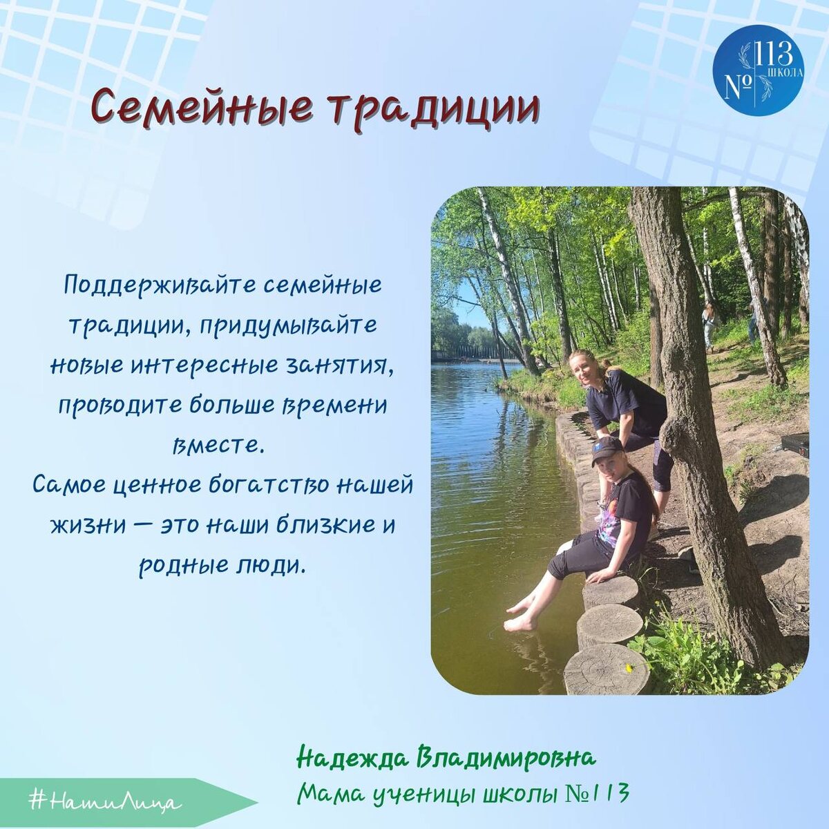 🗯️ Здравствуйте! Вас приветствует мама нашей ученицы, Надежда Владимировна. Самое ценное богатство нашей жизни — это наши близкие и родные люди. Поддерживайте семейные традиции, придумывайте новые интересные занятия, проводите больше времени вместе. Семейные мероприятия позволяют укрепить отношения, создать тёплые воспоминания и сделать жизнь ярче. ⏳ Время, проведенное вместе с близкими людьми, становится особенным моментом нашей жизни. Оно создает теплые воспоминания, укрепляет отношения и дарит радость каждому участнику семейного круга. Семья — это наша маленькая вселенная, наполненная любовью, заботой и поддержкой. Но как сделать семейные встречи интересными и незабываемыми? ☝️Важность семейных традиций. Семейные традиции помогают сохранять связь поколений, передавать опыт и создавать атмосферу тепла и уюта. Это могут быть совместные ужины, прогулки на природе, чтение книг перед сном или даже настольные игры. Такие ритуалы становятся частью семейной культуры и делают жизнь ярче