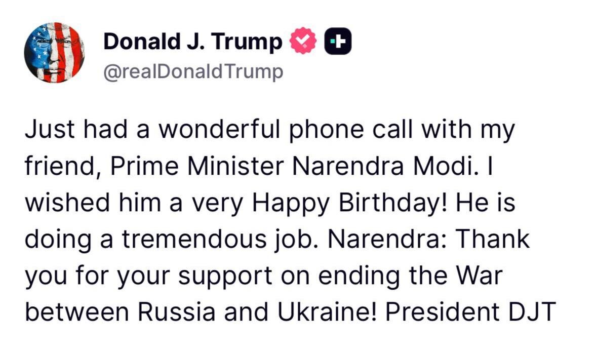 🗣 Трамп и Моди провели телефонный разговор. Два лидеры не щадили комплиментов Трамп заявил, что провел "чудесный" разговор с Моди, поблагодарив его за поддержку урегулирования конфликта на Украине. А Моди поблагодарил Трамп за поздравления с днем рождения. Добрый тон в словах Трампа и Моди может намекать на продолжение переговоров по торговой сделке. Они возобновились после поездки Моди в Китай. #ПолитикаМИР @if_news