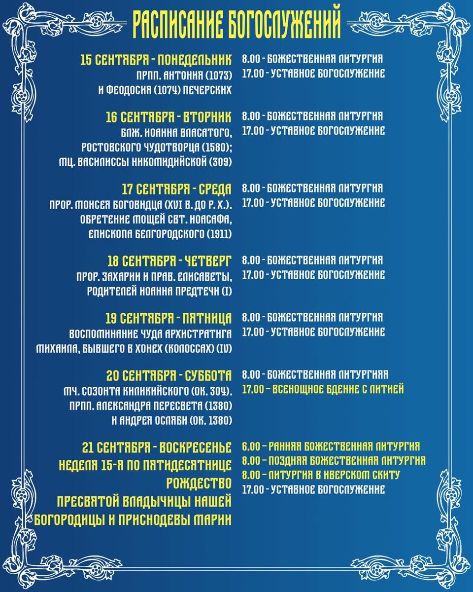 Расписание богослужений 15 - 21 сентября