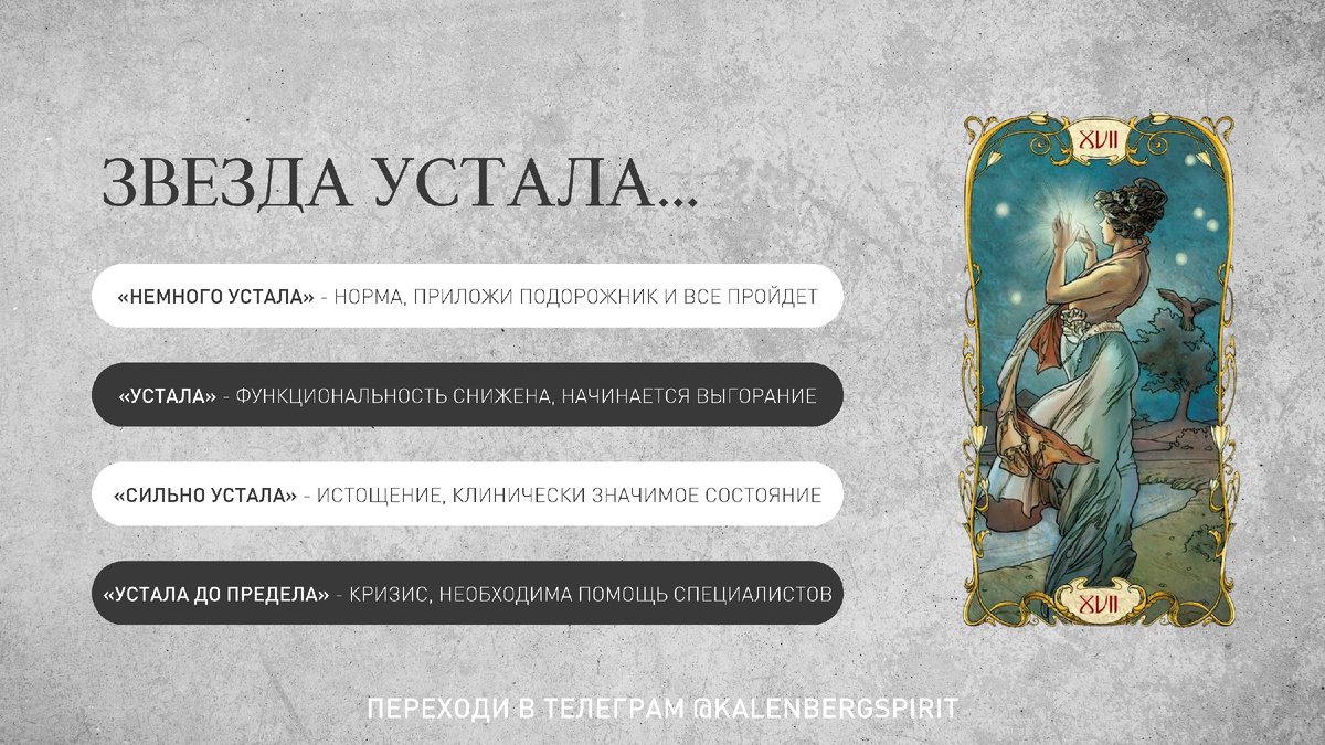 В статьях серии «уставшие энергии» я использую принцип шкалы, которая дает понять, насколько все плохо, можно ли справиться самостоятельно, а также что вас ждет на следующей стадии, если уже сейчас не начать работать с арканом: 🟢 «немного устал» - норма, приложи подорожник и все пройдет; 🟢 «устал» - функциональность снижена, начинается выгорание; 🟢 «сильно устал» - стадия истощения, клинически значимое состояние; 🟢 «устал до предела» - кризис, нужна помощь специалистов. Что предлагаю? Если вы глубоко в 🍑 сейчас, то самосострадания у вас с гулькин нос, поэтому давайте посмотрим на энергии, как на отдельных личностей, живущих внутри, и нуждающихся в поддержке. Подойдите к анализу с сочувствием, пониманием и стремлением помочь. Обнимаю! Звезда чувствует свою уникальность, но часто сомневается, можно ли быть такой, какая она есть. Человек всё реже проявляет себя искренне, чаще живёт ожиданиями окружающих, мечты становятся «глупыми», самореализация второстепенной. Кажется, что самореа