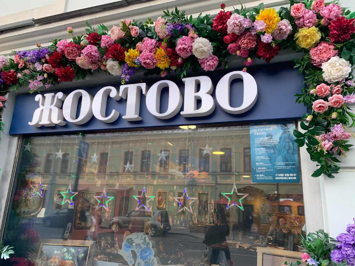 Пятницкая улица одна из моих любимых. Мне нравится по ней прогуляться, любуясь купеческой Москвой и одновременно современным ритмом жизни на этой старейшей улице, которая появилась в конце XV — начале XVI веков как часть старомосковской дороги на юг. Глядя на архитектуру старинных особняков и храмов, на многочисленные кафе в современном антураже, я никогда не обращала внимание на вывеску "Жостово" А может быть она не была столь яркой. Но в этот раз мой взгляд зацепил эту красивую цветочную гирлянду и ноги сами повернули в сию красоту. Да, наверное, у каждого в доме есть что-то из продукции этого старинного промысла. Вряд ли найдется кто-то в России, кто не знает Жостово. Да и не только в России. Жостово давным-давно. известно в мире. У меня подруга в Монреале, уроженка Канады в восторге от жостовских изделий.. Я ей дарила самовар, поднос тарелку и шкатулку От подарков она была в невероятном восторге. В прошлом году шикарную рекламу Жостово сделал ГУМ. Весь ГУМ был украшен в стиле этого удивительного давнего старинного промысла. Промысел по росписи кованых металлических подносов, возник в 1825 году в деревнях и селах Московской области (Мытищинский район ), среди которых было и Жостово. Появились мастерские, где расписывали лакированные изделия из папье-маше. В это же время местные мастера, братья Вишняковы, стали расписывать еще и металлические подносы. Упоминания о деревне Жостово восходят ещё к середине XVIII века. Так на "Плане Царствующего Града Москвы с показанием лежащих мест на тридцать верст вокруг", изданном впервые в 1763 году, уже отмечена деревня "Жостова". Рождение промысла связывают с фамилией братьев Вишняковых. Бывший крепостной графа Шереметева Филипп Вишняков начал расписывать подносы из папье-маше. Его сыновья в 1825 году открыли в Жостово собственную мастерскую, входящую в тройку самых крупных в уезде – "Заведение Братьев Вишняковых". Предприимчивый крепостной графа Шереметева из деревни Жостово - Филипп Никитич Вишняков, работая в Федоскино возчиком на местной мануфактуре, уловил технологические особенности производства лакированных изделий и открыл свою "лакерную" мастерскую.В 1839 году жостовские подносы приняли участие в Промышленной Всероссийской выставке. К концу века промысел развернулся на «широкую ногу», причем основным видом изделий стали металлические подносы, практически вытеснившие поделки из папье-маше. Окончательно оформился и процесс производства, неизменный вот уже второе столетие. В Федоскино делали расписные изделия из папье-маше под лак: шкатулки, ларцы, портсигары, табакерки, спичечницы, конфетницы, подносы. Филипп Никитич ездил в Москву продавать товар, а потом на Цветном бульваре открыл лавку. О чем свидетельствует и старинная вывеска, которая теперь в музее в Жостово.На одной из ярмарок сын Филиппа Никитича Осип встретил конкурентов с Урала, которые торговали металлическими расписными подносами. Осип Вишняков решил тоже перейти с папье-маше на металл. К 1830 году производство подносов в деревне Жостово и окрестных селениях Осташково. Хлебниково, Троицкое увеличилось. Началось производство первых кованых металлических подносов, украшенных декоративной цветочной росписью. Благодаря расположению вблизи Москвы жостовские мастера имели постоянный рынок сбыта своих изделий и возможность их п