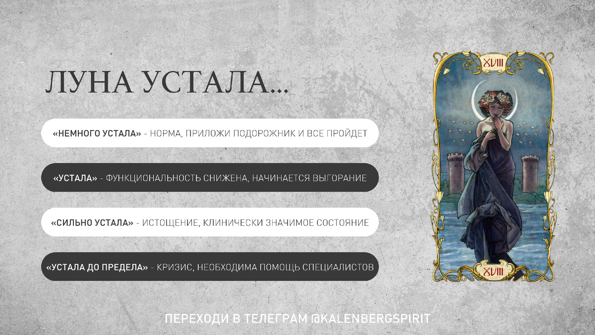 В статьях серии «уставшие энергии» я использую принцип шкалы, которая дает понять, насколько все плохо, можно ли справиться самостоятельно, а также что вас ждет на следующей стадии, если уже сейчас не начать работать с арканом: 🟢 «немного устал» - норма, приложи подорожник и все пройдет; 🟢 «устал» - функциональность снижена, начинается выгорание; 🟢 «сильно устал» - стадия истощения, клинически значимое состояние; 🟢 «устал до предела» - кризис, нужна помощь специалистов. Что предлагаю? Если вы глубоко в 🍑 сейчас, то самосострадания у вас с гулькин нос, поэтому давайте посмотрим на энергии, как на отдельных личностей, живущих внутри, и нуждающихся в поддержке. Подойдите к анализу с сочувствием, пониманием и стремлением помочь. Обнимаю! Сомневается в себе и других, путает тревогу с интуицией. Включается искажение восприятия, Луна перестаёт доверять себе и миру. Иллюзии, догадки, страхи становятся сильнее фактов. Человек тонет в своём бессознательном, не отличает страх от реальности,