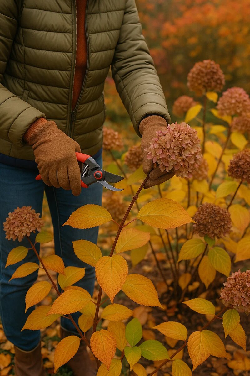 Правильная осенняя обрезка — ключевой этап ухода за гортензиями, который помогает растениям пережить зиму и обеспечивает обильное цветение в следующем сезоне. Подход зависит от вида гортензии, так как разные группы образуют цветочные почки на побегах прошлого или текущего года. Основные цели осенней обрезки: Важное правило: Для большинства регионов России осенняя обрезка считается безопаснее весенней. Проведенная после листопада и до устойчивых морозов, она не вызывает обильного сокодвижения, которое может ослабить растение ранней весной. Сроки проведения обрезки: Особенности обрезки по видам гортензии: 1. Гортензия крупнолистная (садовая)