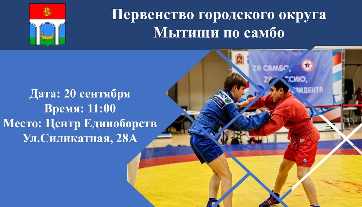 20 сентября в 11:00 на ковре Центра единоборств спортивного комплекса «Строитель» (ул. Силикатная, 28А) пройдет Первенство Мытищ по самбо.