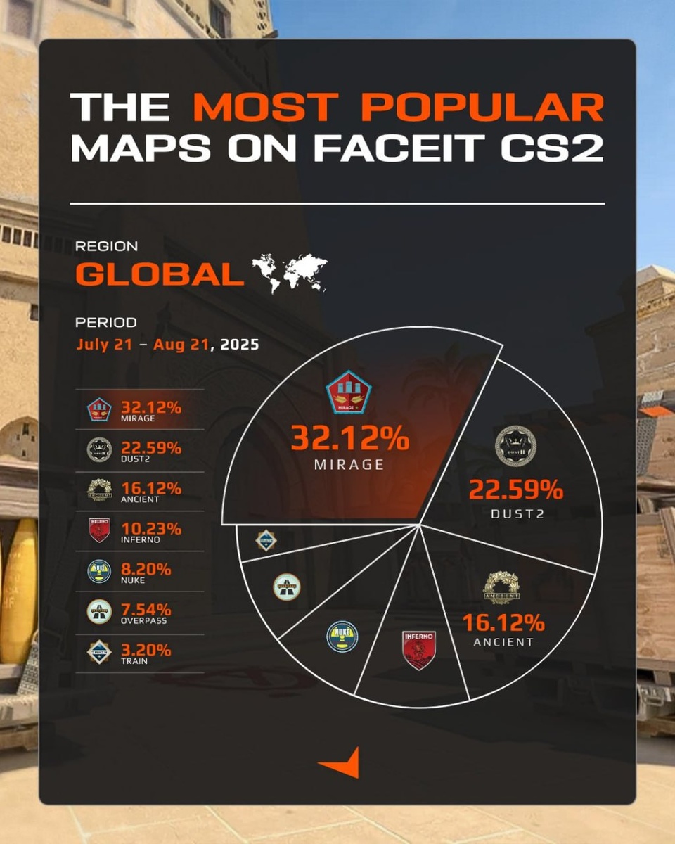 Самые популярные карты на FACEIT за последний месяц (я думал инферно и нюк на ласт месте)