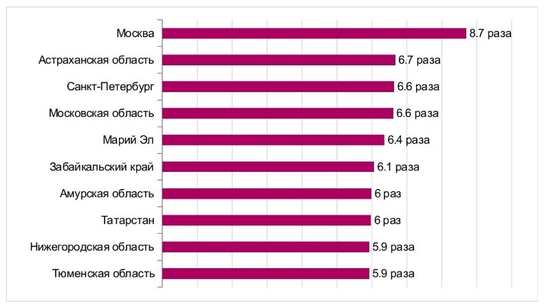 Лидером топ-10 стала Москва, где сосредоточена значительная доля высокооплачиваемых специалистов: разрыв в столице составляет 8,7 раза: наименее оплачиваемая пятая часть получает около 50,8 тыс. руб., а средняя зарплата верхней группы достигает 441,6 тыс. руб.